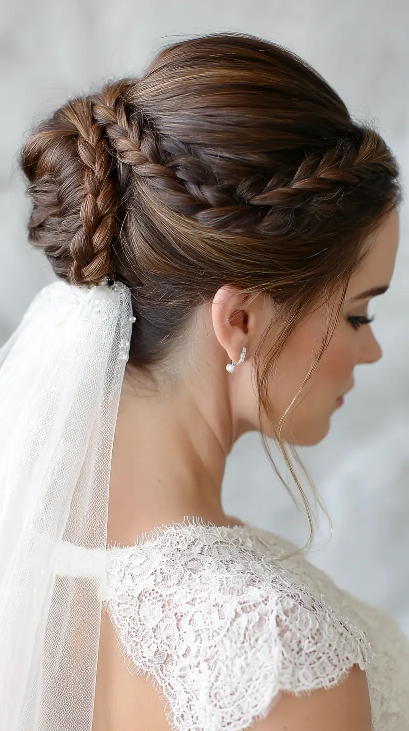 Combining braids and a low bun gives structure and romance in one look. This style works beautifully with cathedral-length veils or lace-trimmed pieces. It’s secure, sophisticated, and looks stunning from every angle—especially in those close-up back shots.